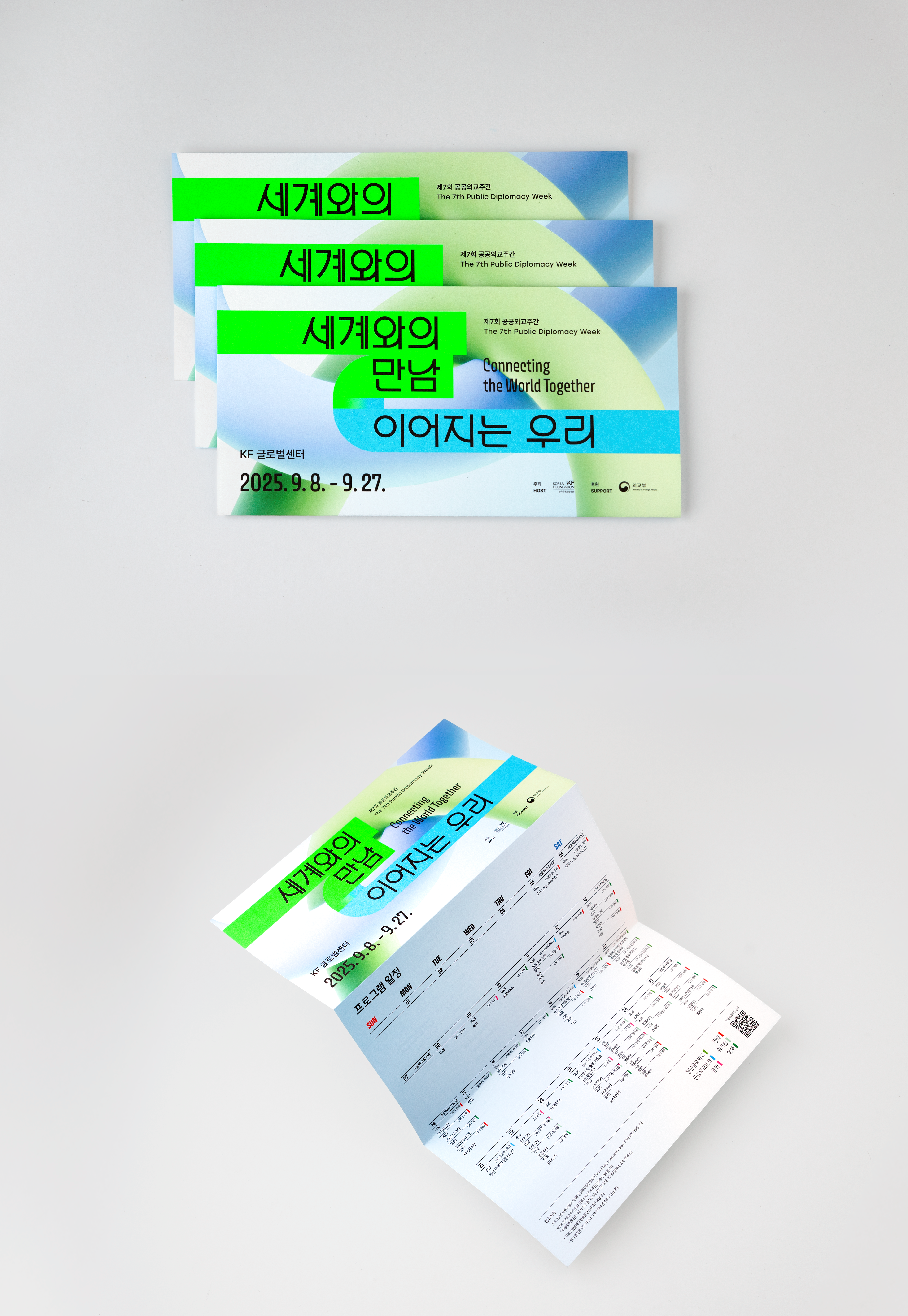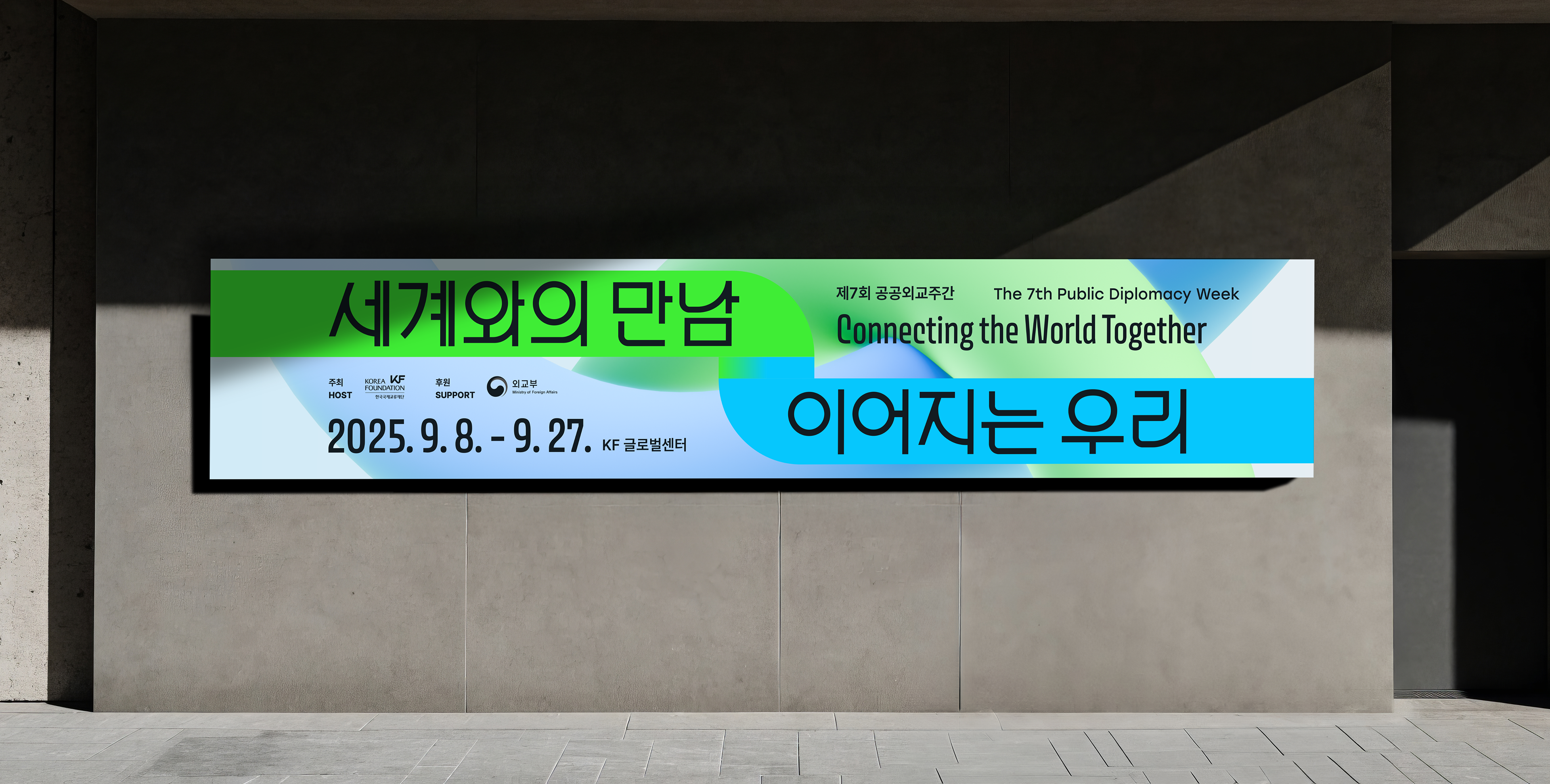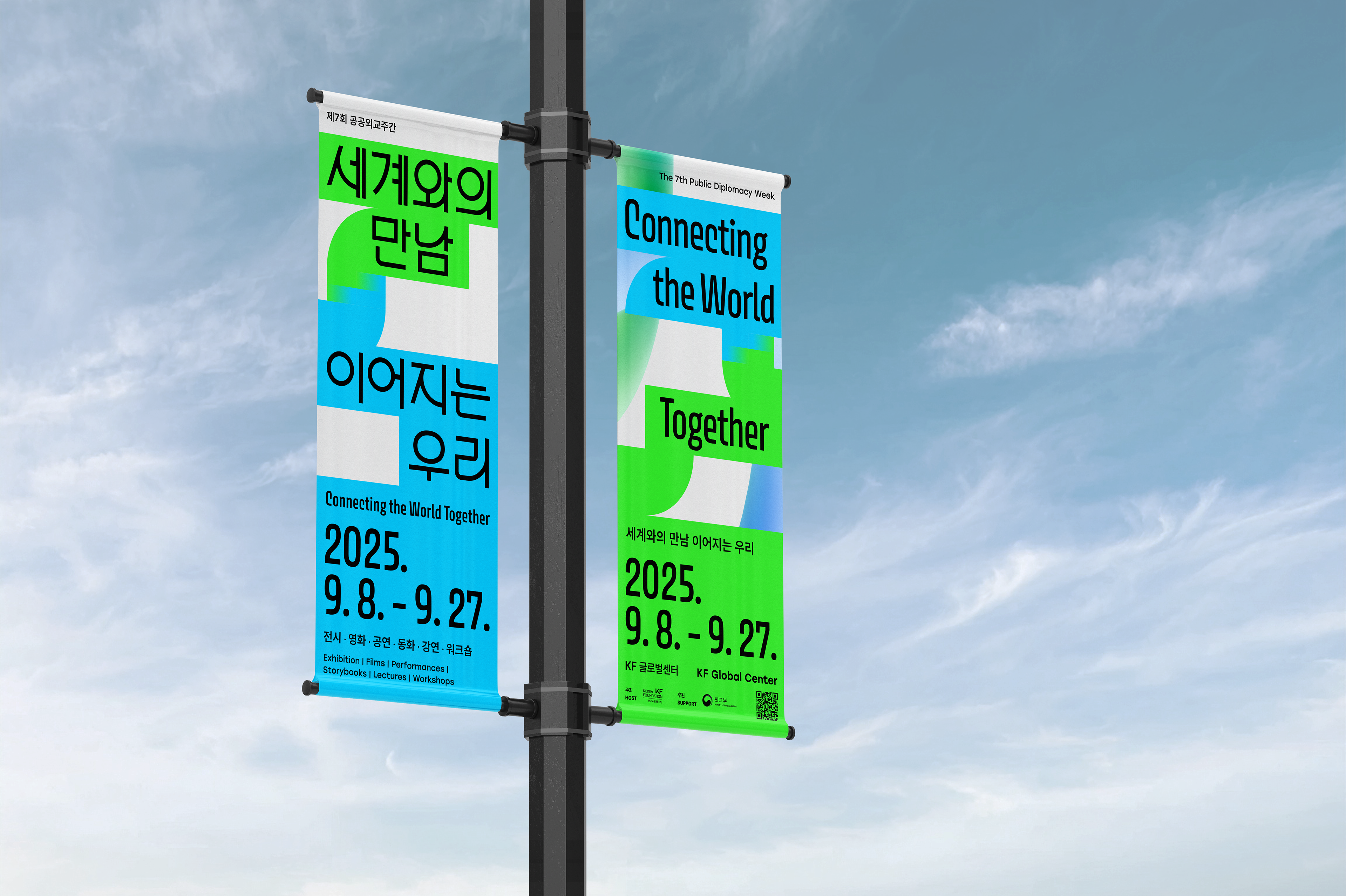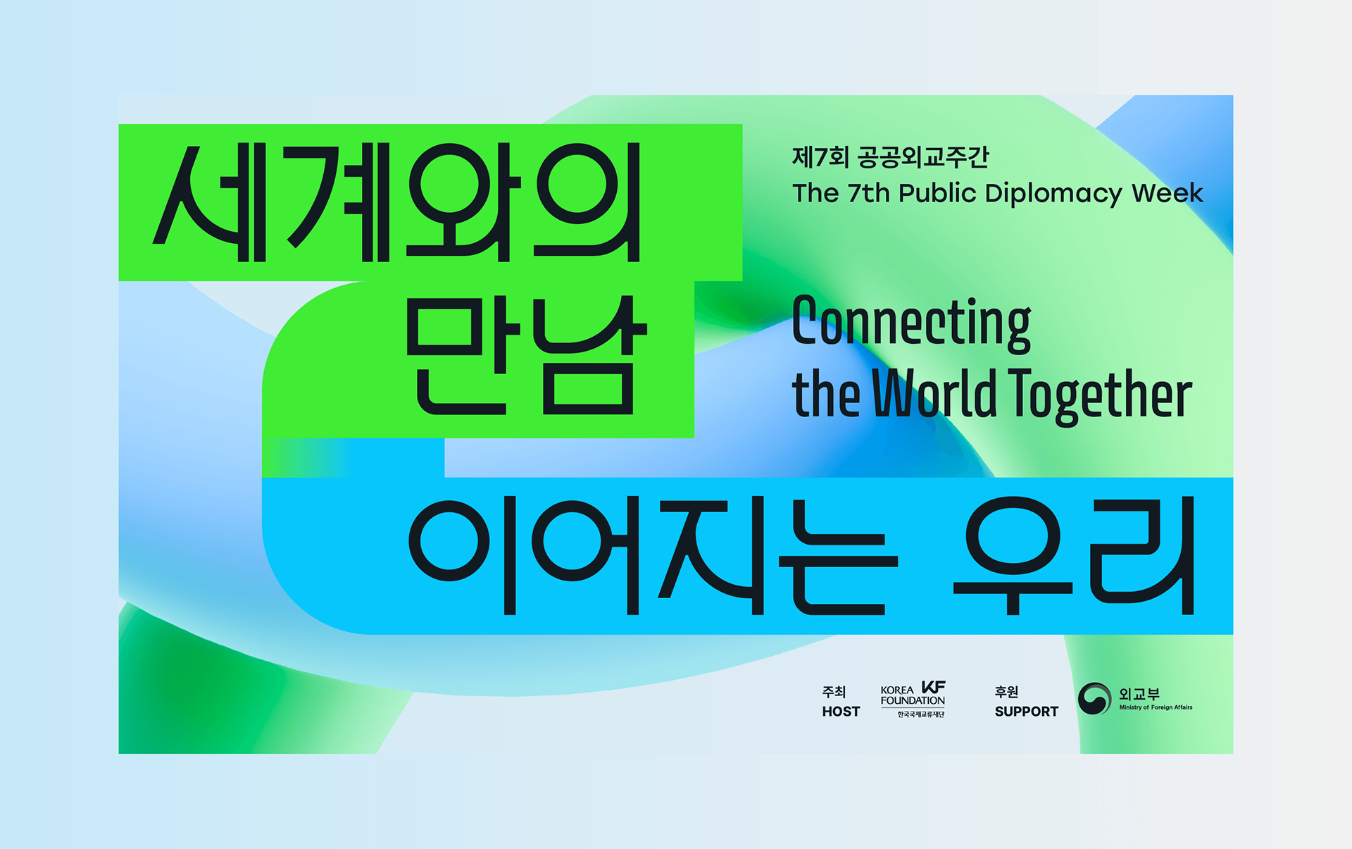 <제7회 공공외교주간>은 “세계와의 만남, 이어지는 우리”를 주제로 그리스, 이탈리아, 태국, 폴란드 등 33개국 주한외국공관 및 문화원, 국제적십자위원회, 식량농업기구(FAO) 등 국제기구·대학·공공기관 등이 참여한 공공 이벤트입니다. 프론트킷은, 글로벌 시대를 관통하는 국가간의 ‘초연결성’과 ‘필연적 상생’을 의미하기 위해 ‘고리’를 모티브로 삼았으며, 서로 연결되고 혼합되어 어우러지는 방식으로 메인 행사의 키비주얼, 공간디자인, 영상 등 일체의 브랜드 애플리케이션에 반영하였습니다. 마스터 그래픽은 대사관 연계 프로그램 4종과 서브 프로그램 2종에 대한 마스터 그래픽으로도 개발되어 입체적인 비주얼 임팩트를 조성하였습니다.