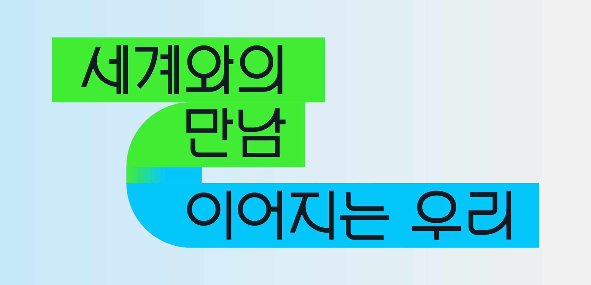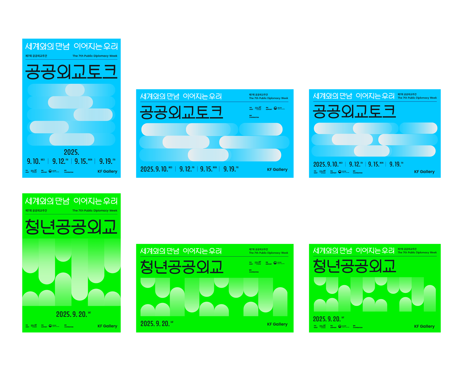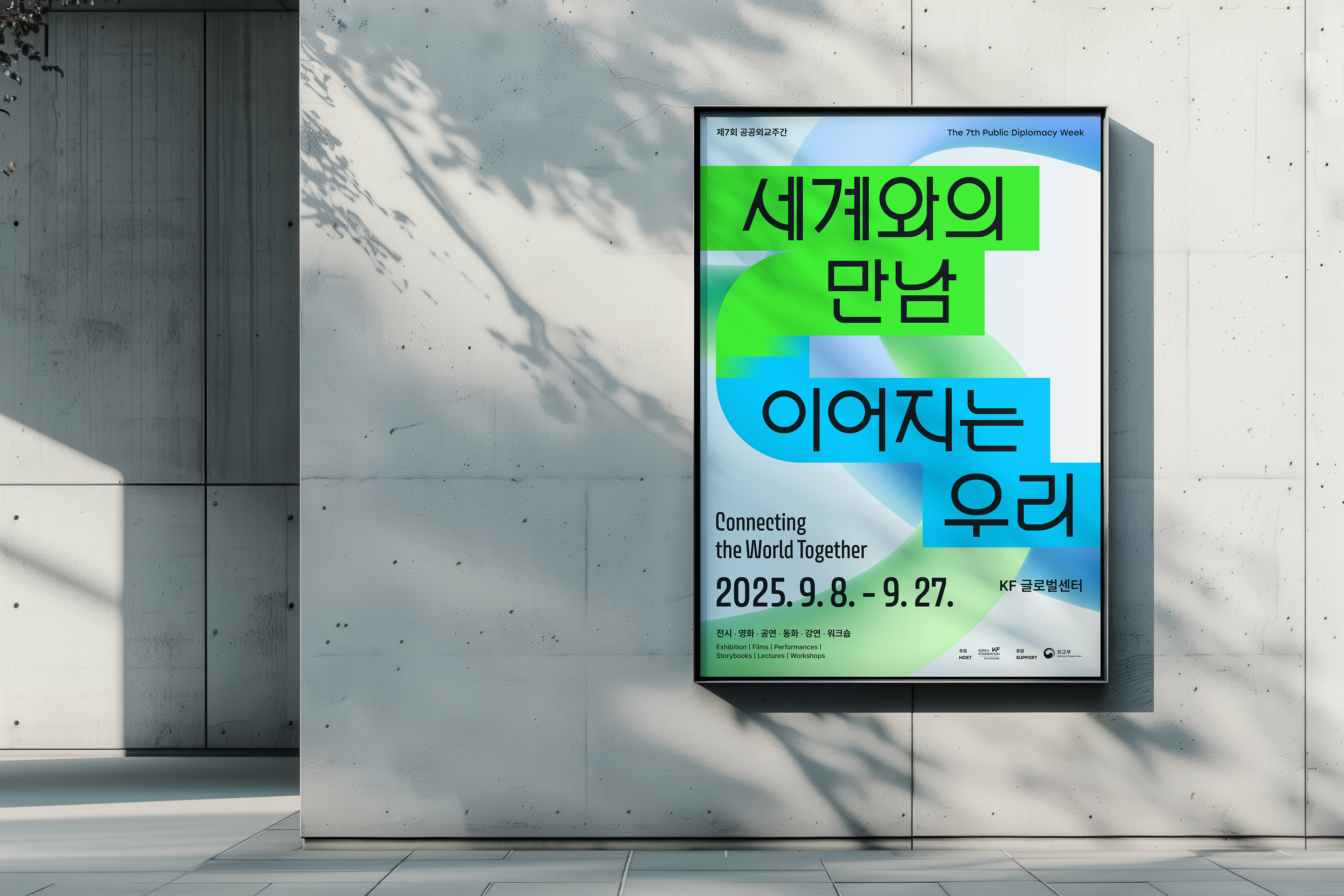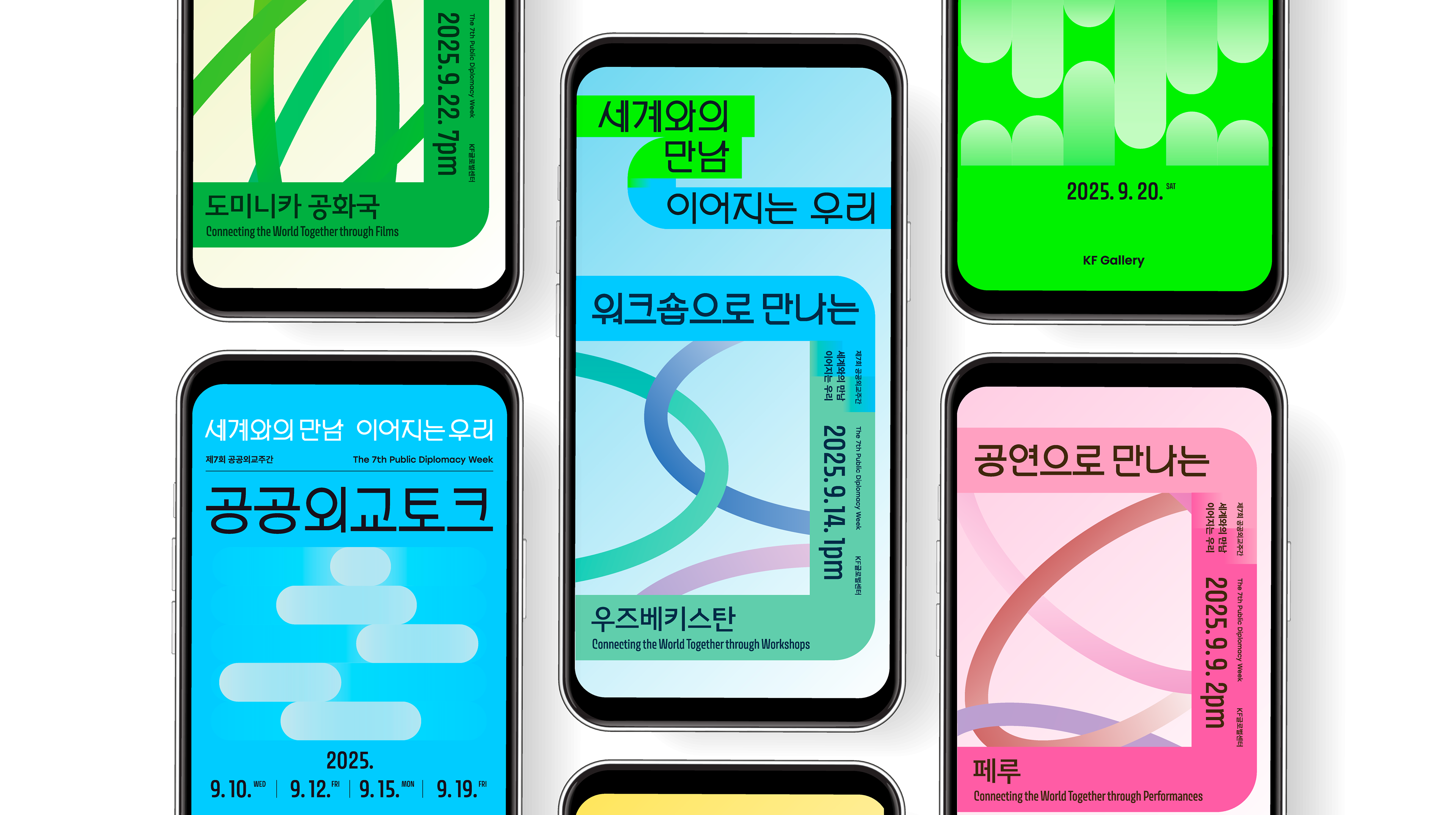 <제7회 공공외교주간>은 “세계와의 만남, 이어지는 우리”를 주제로 그리스, 이탈리아, 태국, 폴란드 등 33개국 주한외국공관 및 문화원, 국제적십자위원회, 식량농업기구(FAO) 등 국제기구·대학·공공기관 등이 참여한 공공 이벤트입니다. 프론트킷은, 글로벌 시대를 관통하는 국가간의 ‘초연결성’과 ‘필연적 상생’을 의미하기 위해 ‘고리’를 모티브로 삼았으며, 서로 연결되고 혼합되어 어우러지는 방식으로 메인 행사의 키비주얼, 공간디자인, 영상 등 일체의 브랜드 애플리케이션에 반영하였습니다. 마스터 그래픽은 대사관 연계 프로그램 4종과 서브 프로그램 2종에 대한 마스터 그래픽으로도 개발되어 입체적인 비주얼 임팩트를 조성하였습니다.
